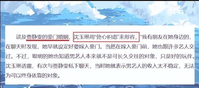 台湾著名主持人沈玉琳曾说贾静雯的豪门婚姻是“处心积虑”,他说贾静雯在嫁入豪门之前,与多名男艺人是很好的玩伴。
