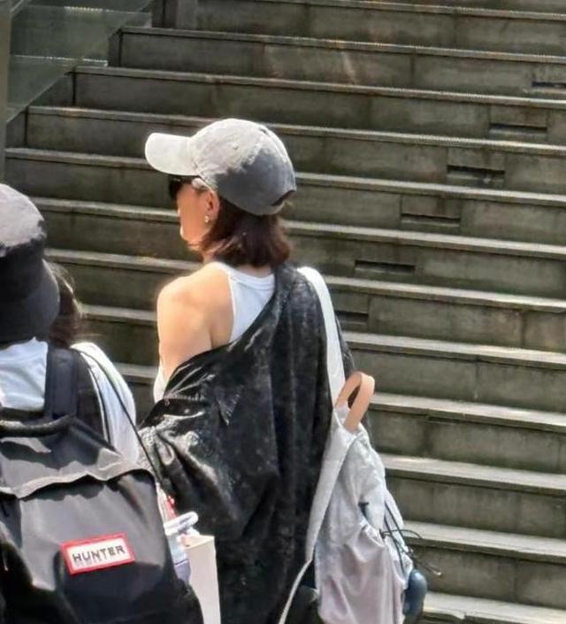 从照片中看到贾静雯身穿黑色开衫,内搭白色吊带,头上戴着棒球帽,帅气又不失妩媚。