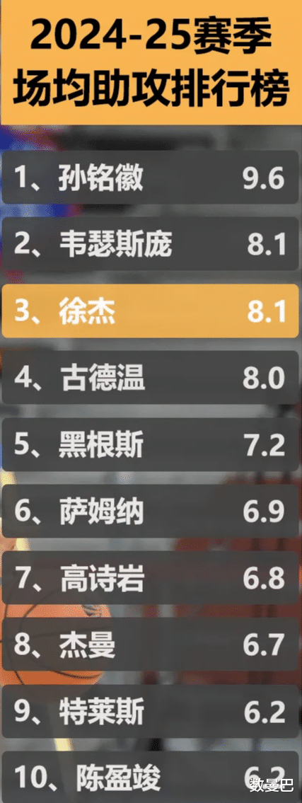 不得不说,徐杰本赛季的表现真的太出色了!本赛季,他场均可以贡献15.6分4.0板8.1助1.4断,助攻在所有球员中排第3,得分在国内球员中排第九。本赛季,广东队找不到合适的小外援,再加上胡明轩又受伤了,球队进攻组织梳理的重任就全部落到了徐杰的身上。并且,因为广东队只有徐杰这一个进攻发起点,所以对手都会安排防守能力最强的后卫来盯防徐杰。但是,在小胡受伤后,徐杰场均砍下17.5分4.6板9.1助1.4断,表现反而更加出色。