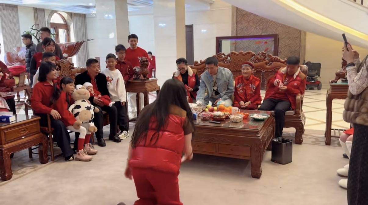 杨子的女儿也回来了,女儿同样跪在地上给杨子拜年、杨子也是直接把红包扔了过去,并没有任何的区别对待。