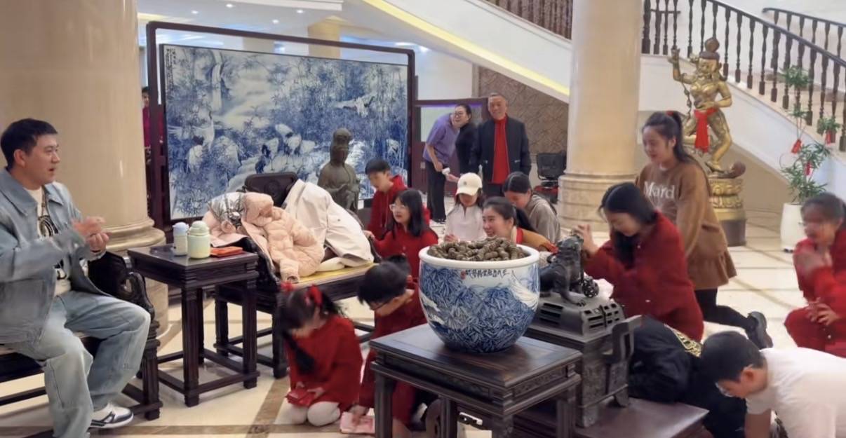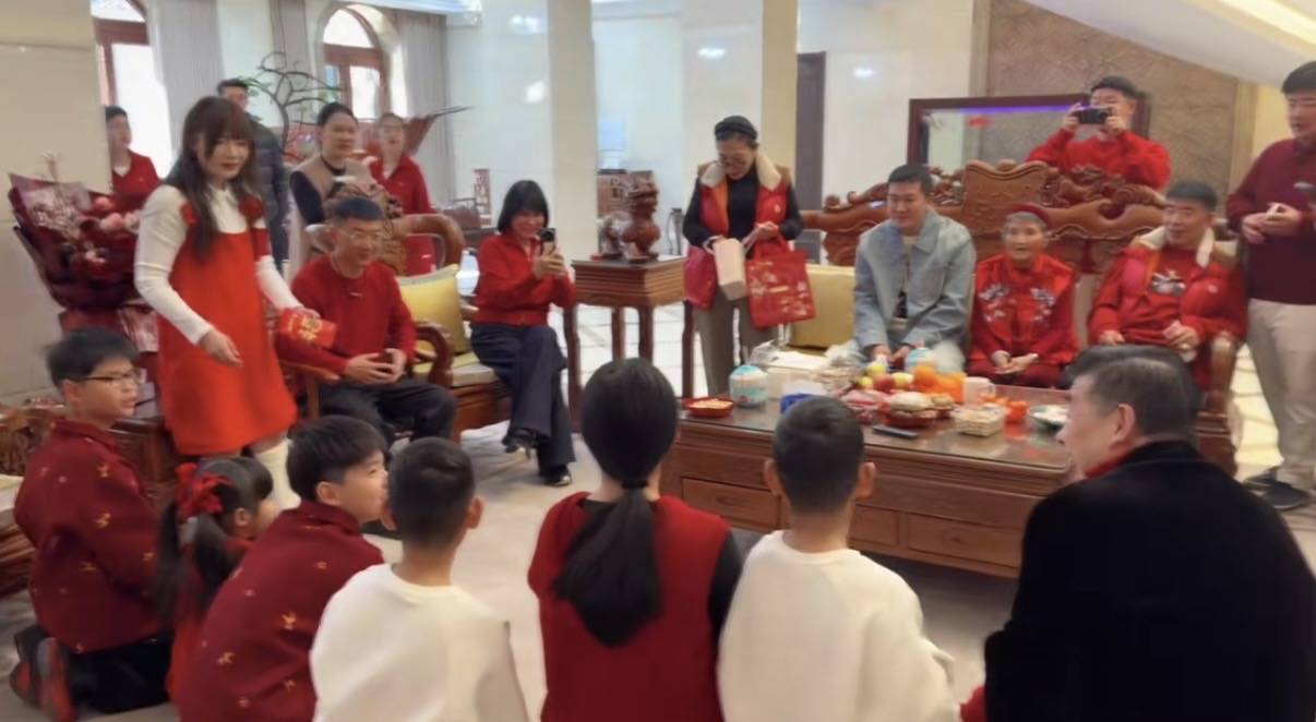 不过当时的场景比较热闹,大家都是有说有笑的。孩子们跪地磕头拜完年之后,杨子机会给孩子们派红包。