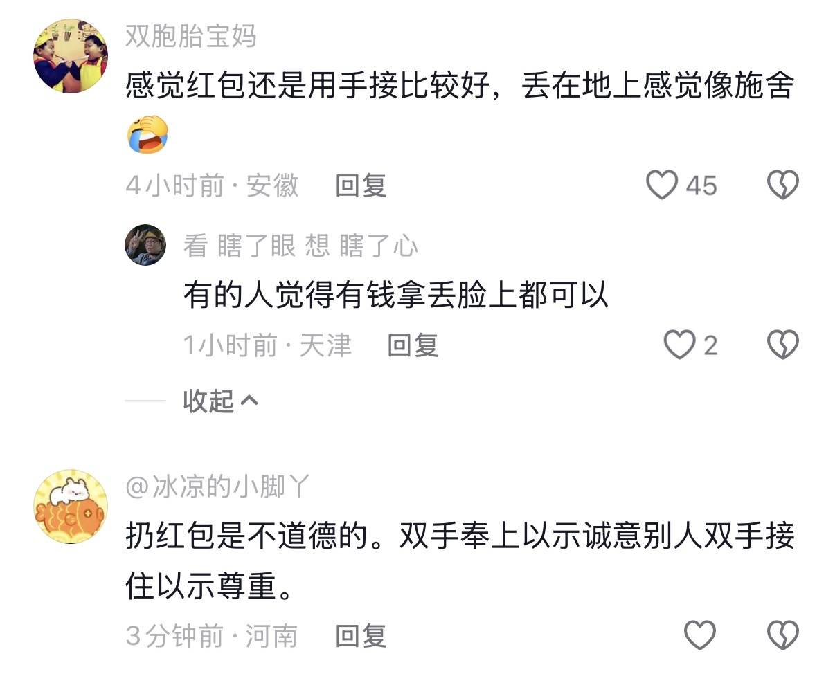 不少网友都感叹,拜年红包还是用手接比较好,感觉丢在地上有点像施舍。