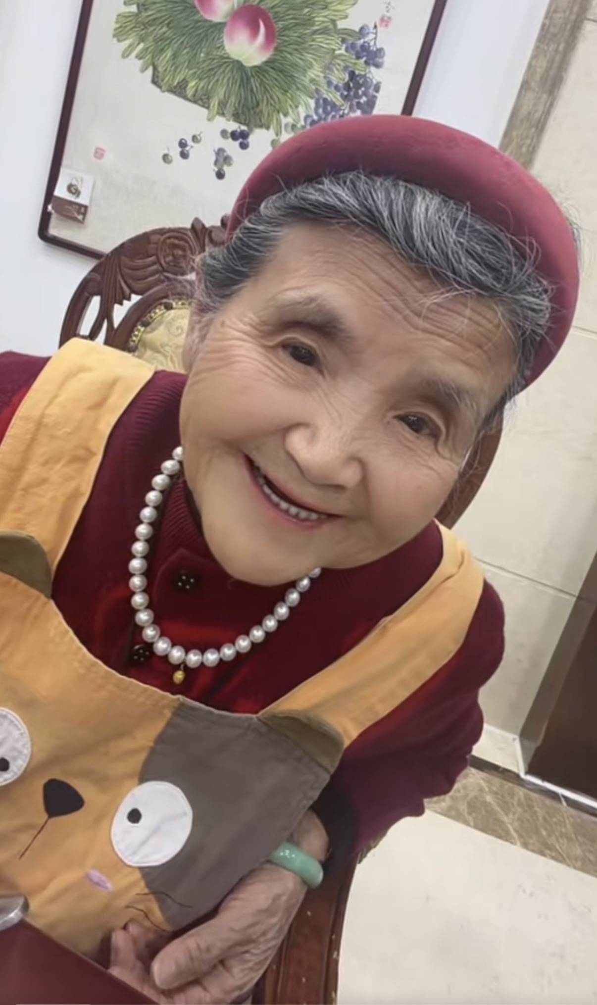 杨子和妈妈坐在一张大大的实木椅子上,身旁还有一男一女。应该都是家里辈分比较高的人,其中三人同穿红衣,只有杨子一身牛仔套装特别休闲。