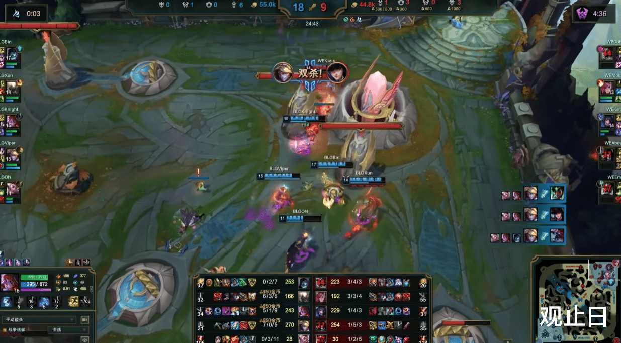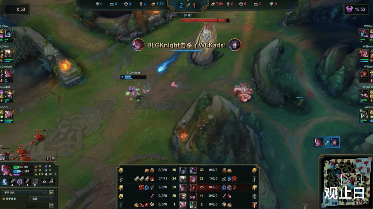 第一局:BLG下路开局就线杀WE双人组,Xun皇子节奏拉满,knight发条全场游龙。