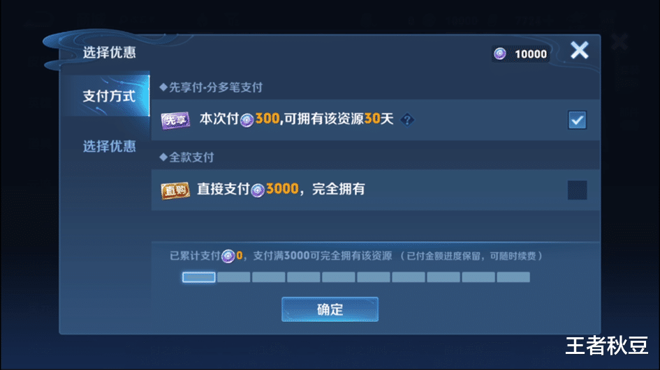 部分新上架星传说皮肤支持先享付,不用一次性付全款,可按多笔每支付一期款项即可拥有一期该商品。如孙尚香星传说需要3000星币,分10期付款,每一期需要给300星币。只要给了300星币就能享用30天。
