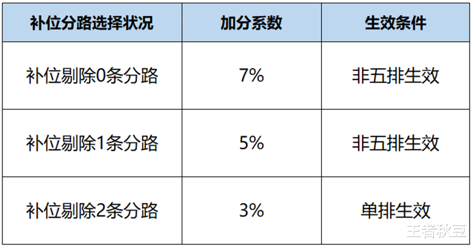 全能选手上分更快,补位剔除0分路可以额外加7%,剔除1条分路额外加5%,剔除2条分路额外加3%(单排生效)。若王者段位以下单排时,以次选分路拿下游戏的胜利将会获得额外3%排位积分。开放补位剔除2条分路后,以补位分路的单排玩家拿下游戏的胜利将会获得额外3%排位积分