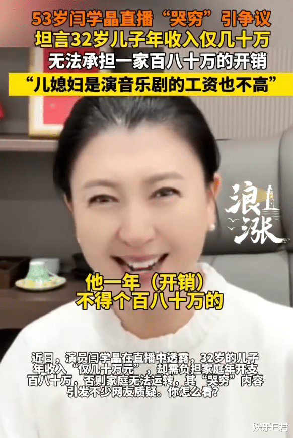 上周,演员闫学晶在直播过程中谈及家庭经济情况时表示,自己32岁的儿子在北京生活和养家压力较大,年开支约80万至100万元,但儿子一年的收入仅为几十万元,这一情况让家庭财务捉襟见肘。她还提到,儿媳从事音乐剧演出,收入同样不高。