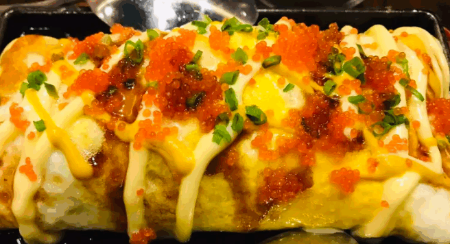 来源:Ken的老厨娘(豆果美食)用料: 鸡蛋2个、 木鱼花、 鱼子、 芝士条、 甜玉米粒做法步骤1 准备材料...步骤2 下一点油把虾仁稍炒热装盘,平底锅洗净再刷油步骤3 鸡蛋里滴少许味淋和一点盐搅匀步骤4 在烧热的锅下一半的鸡蛋摇匀步骤5 放芝士、鱼子、熟玉米粒、虾仁...步骤6 卷起......步骤7 把剩下的鸡蛋液淋上摇匀...步骤8 再卷起...步骤9 淋上黑椒汁照烧汁...步骤10 挤出沙拉...步骤11 木鱼花...【鲍鱼鱼子酱拌饭】