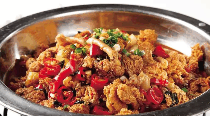 来源:啊二的厨房(百家号)食材&配料: 章鱼腿、基围虾、黑鱼仔酱、老南瓜、白洋葱碎、食用花草、盐、胡椒粉、奶油、牛奶做法:把章鱼腿和基围虾清洗干净后放入盐和胡椒粉调味,加入天妇罗粉拌匀放入油锅中,油温80度炸上色即可。老南瓜去皮后切成小片,清洗干净后放入锅中煮软,加入盐和黑胡椒粉调味,放入一点橄榄油和奶油搅拌成泥即可。盘中加入南瓜泥,放入八爪鱼,放入虾仁,放入鱼子酱后加入食用花草点缀即可。【干锅鱼子酱】