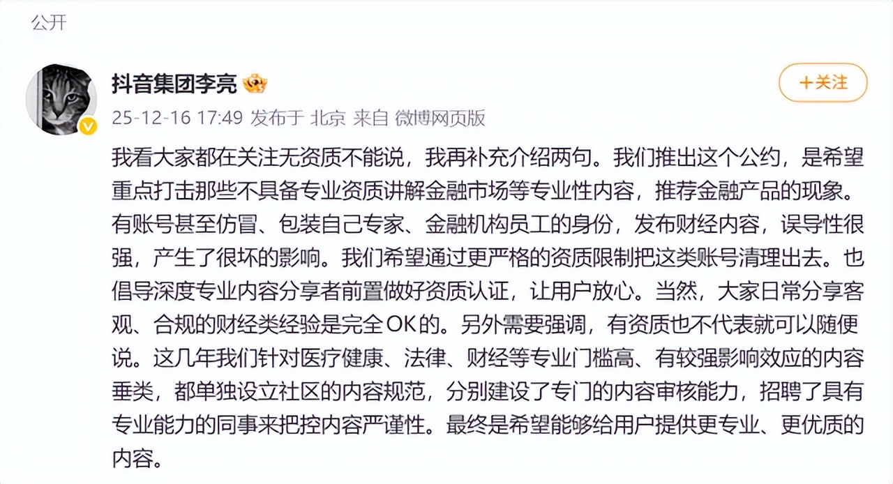 12月16日,@抖音集团李亮发文称,推出财经行业治理公约,是希望重点打击那些不具备专业资质讲解金融市场等专业性内容,推荐金融产品的现象。有账号甚至仿冒、包装自己专家、金融机构员工的身份,发布财经内容,误导性很强,产生了很坏的影响。我们希望通过更严格的资质限制把这类账号清理出去。也倡导深度专业内容分享者前置做好资质认证,让用户放心。当然,大家日常分享客观、合规的财经类经验是完全OK的。另外需要强调,有资质也不代表就可以随便说。