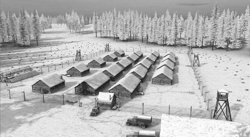 他们于黎明时被驱使开始劳动,又在星辰升起时被驱赶回阴暗拥挤的工棚,也叫监舍。食物是生存的唯一享受,虽然是极少的黑面包和糙米粥,却也负荷起他们身着破烂的棉衣,在寒风中挥舞起铁镐和铁锹,开采矿石或砍伐树木。