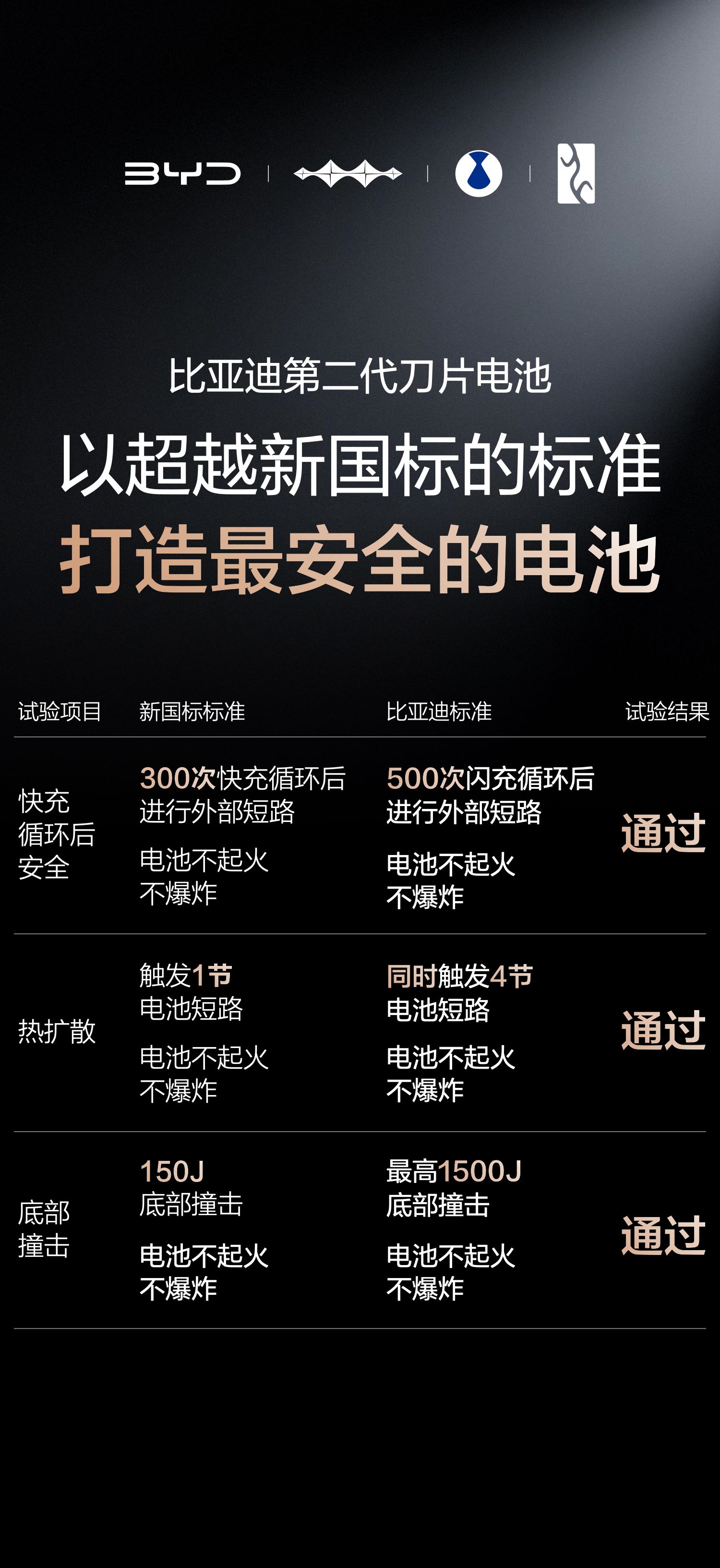 安全标准全面超越新国标,通过500次循环短路、4节电池短路、1500J底部撞击测试。质保政策再升级,电芯终身保修,容量低于77.5%免费包换。