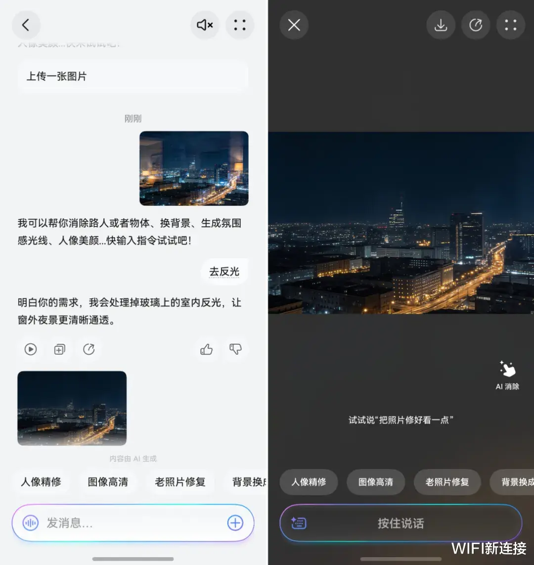 除了扩图、消除等常见玩法,去反光这种细节能力其实更能考验AI助手修图的功底。比如想要p掉从窗户拍夜景时的反光,其他AI助手要么不具备此功能,要么有反光残留处理得不够自然,而小艺可以把反光去得干净、完整,真正意义上的拯救“废片”。可以说,小白和百万修图大师中间,只差了一个小艺。