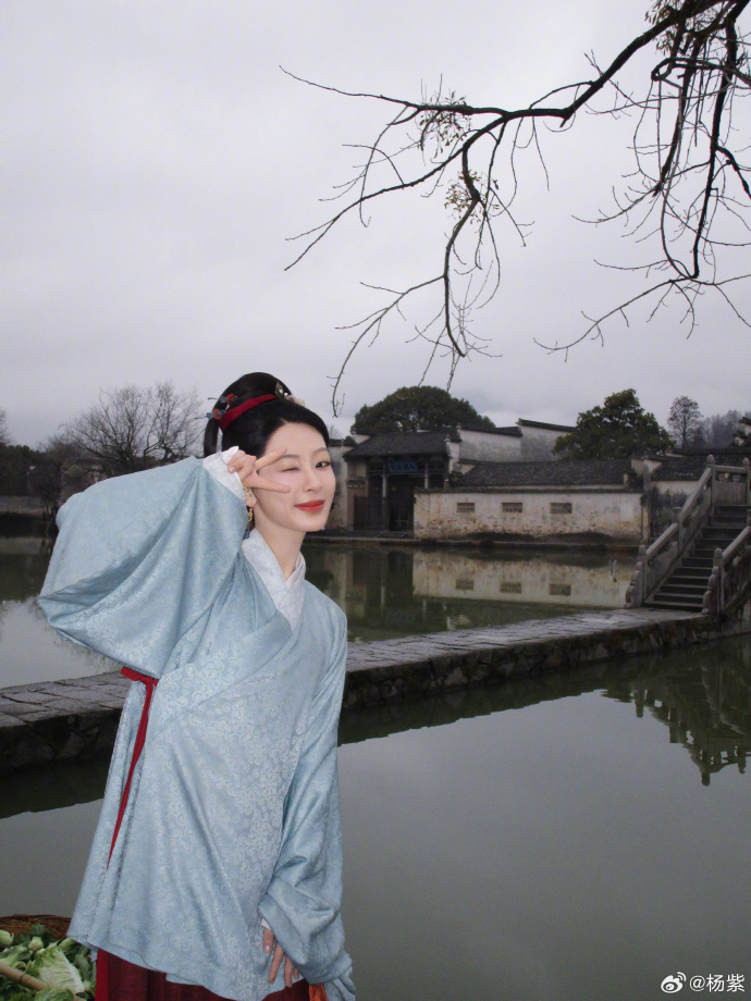 先看这张倚在水边的浅蓝身影,背景是黛色老建筑,秃枝在风里晃。该是拍戏间隙偷的空吧?她抬手拢了拢袖子,水汽裹着风往身上撞,衣摆褶皱还沾着点戏味儿,却松快得像刚从镜头里跳出来喘口气,连眼神都浸着 “偷闲” 的软。