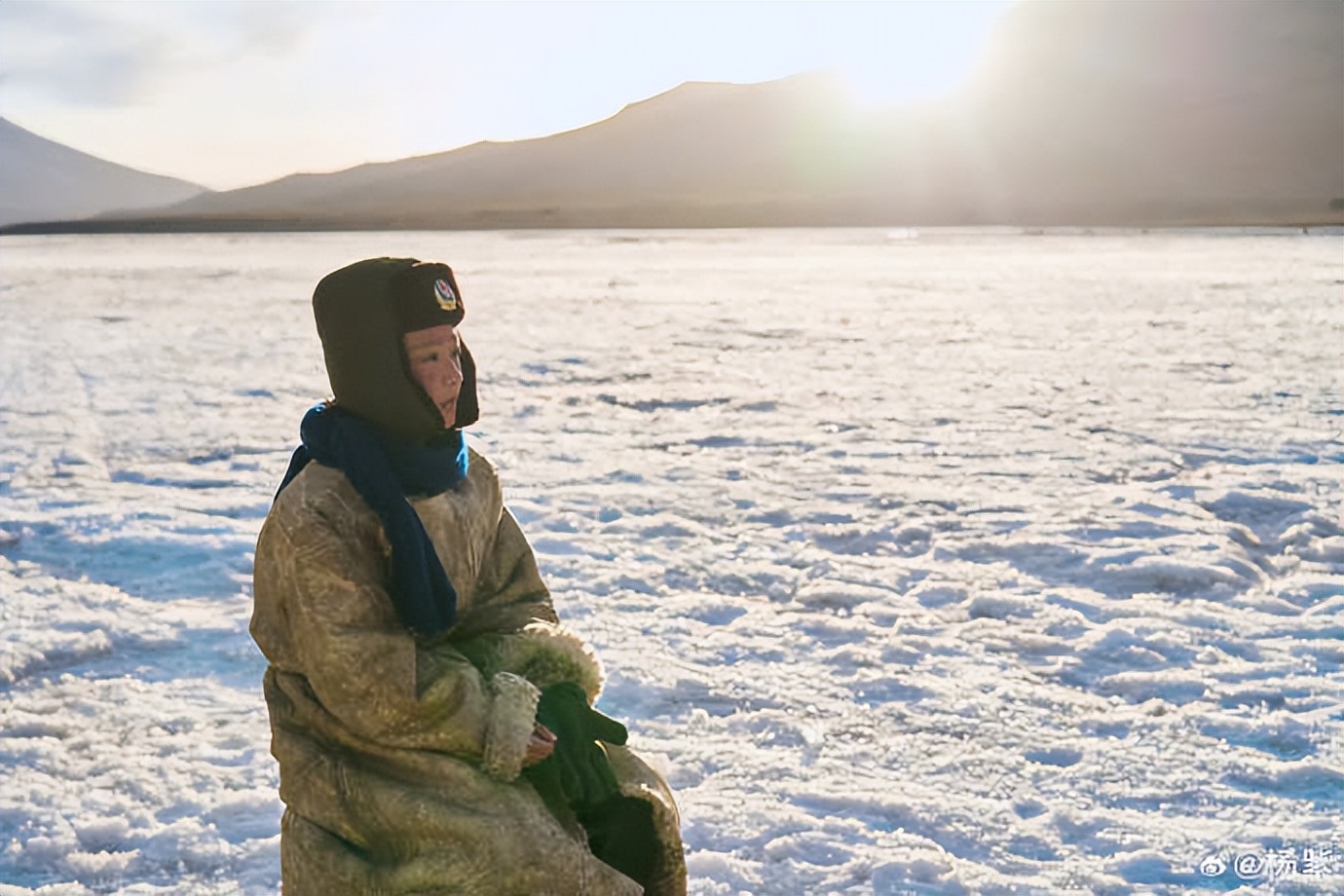 转头就裹成了圆滚滚的模样 —— 厚外套裹到眉梢,往开阔景色前一蹲,头发被冷风吹得乱翘。这该是外景拍摄的间隙,哪是镜头前的演员啊?就是裹暖了想看看风景的普通人,连 “能歇会儿就好” 的松弛都写在肩膀上。