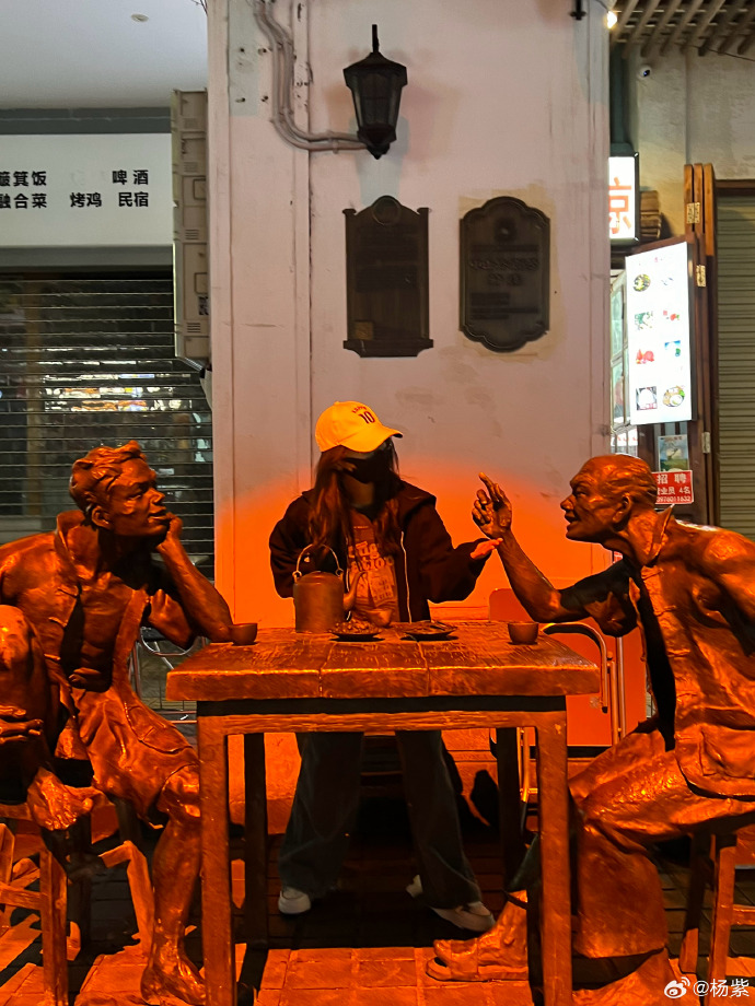 再钻到挂红灯笼的店里,暖黄灯光裹着玻璃门,空气都透着烟火气。该是剧组的小聚餐吧?不用铺排满桌菜,挤在这样的店里,连灯笼的红都沾了饭香,是忙里偷闲的热乎劲儿。