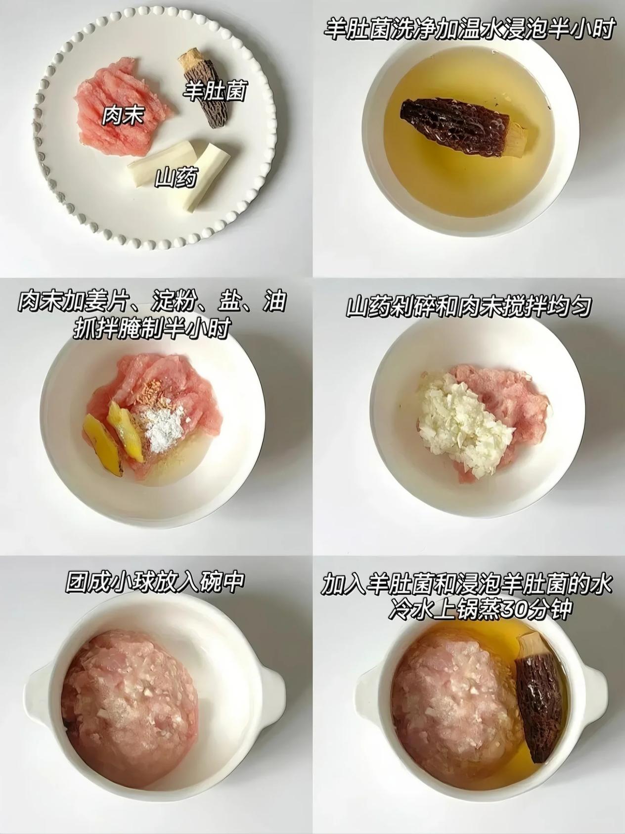 1. 羊肚菌泡软,山药拍碎与肉末混合,加少许山茶油摔打上劲;
