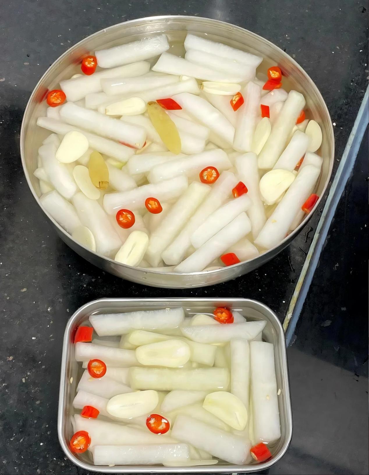 1. 萝卜切条盐糖腌30分钟,冲水沥干;