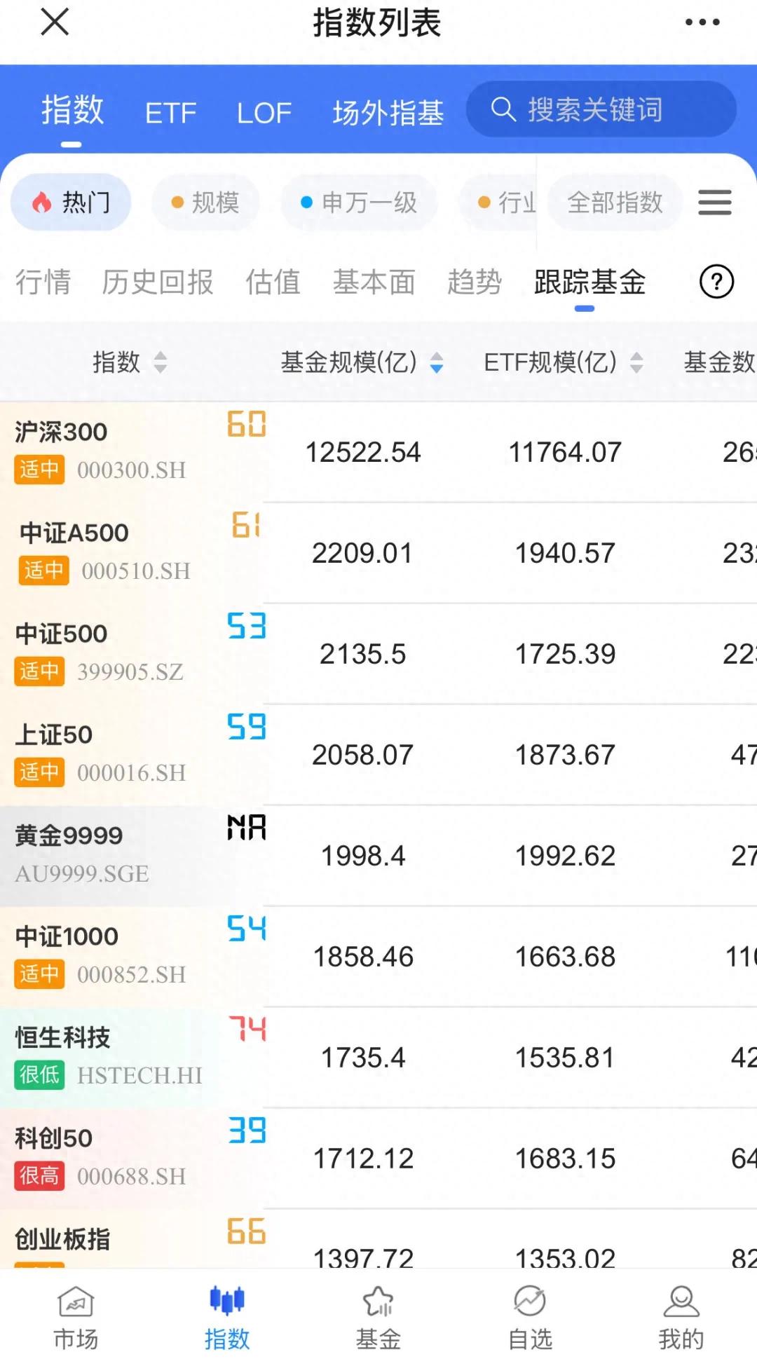目前A股市场跟踪基金总规模最大的指数是沪深300,最新规模高达1.25万亿,遥遥领先的的第一,再的话就是中证A500、中证500、上证50和中证1000,跟踪基金规模均在2000亿左右,不过中证A500由于没有股指期货跟踪,所以重要性要差一点。