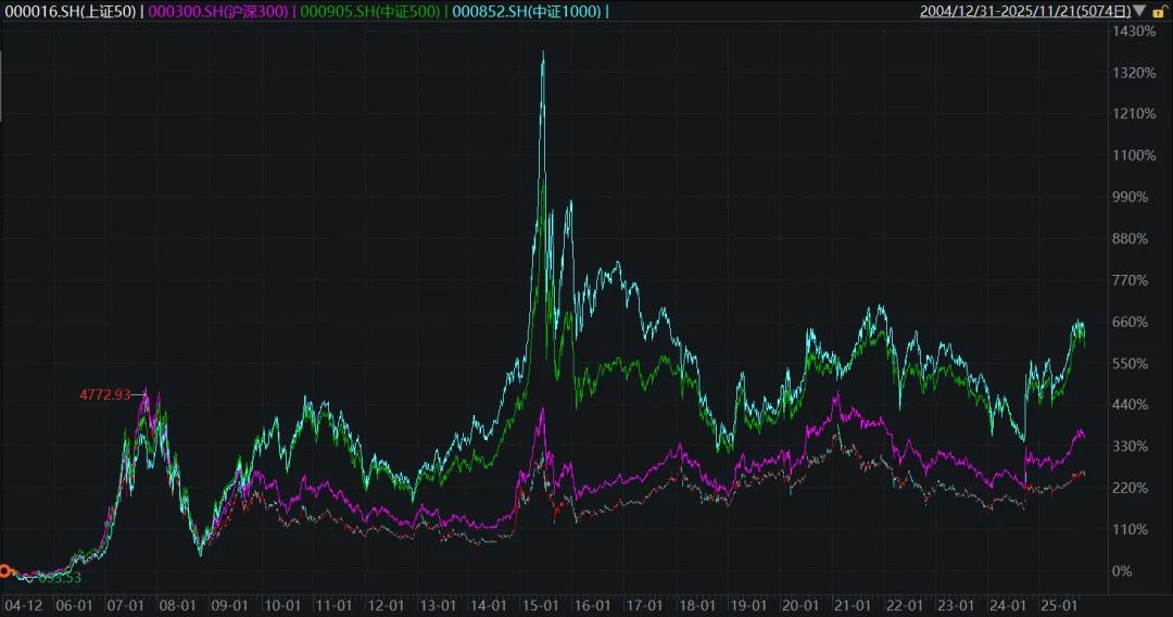 下图是这4只指数自基期起点(2004-12-31)以来的历史走势和涨幅统计: