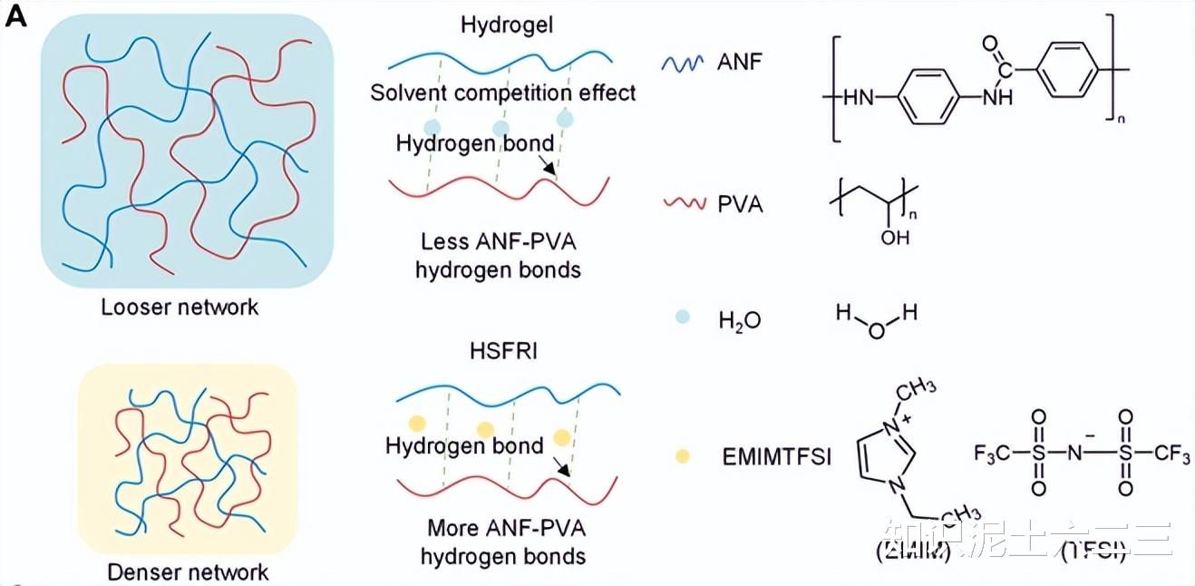 研究团队换了个思路:不用水,改用EMIMTFSI 离子液体当溶剂。这种离子液体的氢键形成能力很弱,不会和聚合物 “抢位置”,反而能让 ANF 和 PVA 之间形成更多氢键,就像给两种材料加了无数 “隐形粘扣”,构建出致密、高度连通的纳米纤维网络。