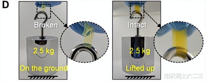 更直观的是实验图里的对比:同样吊起 2.5kg 重物,传统水凝胶瞬间断裂,HSFRI 却能稳稳承重。