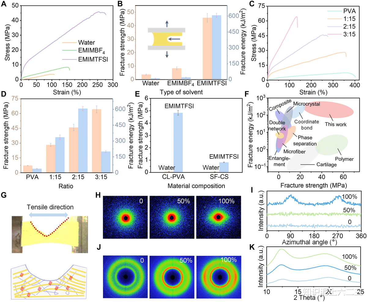 研究团队也证实了这种策略的普适性:把硬相换成纤维素、丝素蛋白,软相换成壳聚糖,用同样的溶剂定制方法,依然能做出高强度离子凝胶。这意味着,未来我们或许能基于这个思路,开发出更多 “又强又韧” 的软材料,应用在柔性机器人、组织工程、能源存储等领域。
