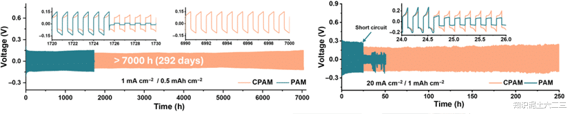 在 Zn||Zn 对称电池测试中,CPAM 电解质展现出惊人的稳定性: