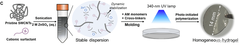 团队通过 “阳离子表面活性剂分散 + 光聚合” 两步法实现 SWCNTs 的均匀嵌入: