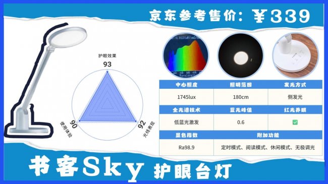 如果你的预算在三百元左右,可以看看书客Sky,它是实测下来最让我惊喜的一款。采用低蓝光激发全光谱技术,将有害蓝光控制在0.6左右,和不少千元级产品持平;同时加入RRT2.0红光养眼技术,让光谱结构更接近自然光,是同价位极少见的配置,护眼比很多入门款扎实。照明能力上,它延续了品牌的DT多维漫射2.0和五域环控光学系统,通过多次折射与扩散,让光线更柔和自然,柔和度提升了93%,实测中心照度达到1745lux,同时覆盖180cm桌面,实用性很好。此外,它的实测显色指数达到了Ra98.9、R9冲到99,色彩还原能力非常突出。能在三百元价位做到“低蓝光+红光增强+高显色”的组合,确实是性价比之王。