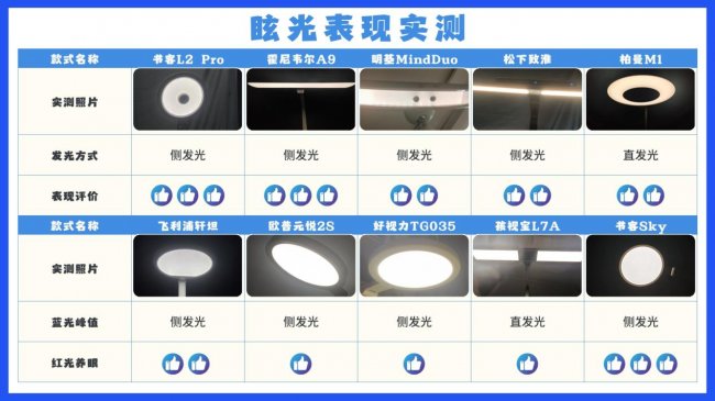 · 明基MindDuo、松下致准、飞利浦轩坦表现中规中矩,轻微眩光但日常使用影响不大;柏曼M1作为直发光款,通过环形设计优化,眩光控制中等