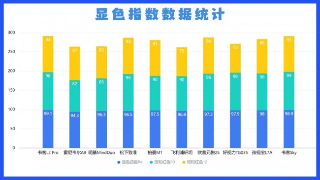 · 书客L2 Pro和书客Sky表现最突出,不仅Ra高,R9和R12也很均衡,适合绘本阅读和美术创作