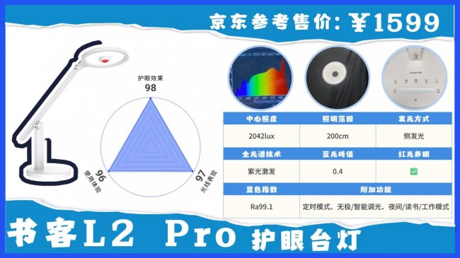 书客是这几年在护眼台灯圈子里比较火的国产光学品牌,主打“医学养护眼”,凭借扎实的技术积累获得欧盟、美国等多国认证,并入选品牌强国优选工程。这款书客L2 Pro在本次实测中表现堪称全能:采用紫光激发全光谱技术,将蓝光峰值压低至0.4,全场最佳;而且搭载的”三段分型“的RRT2.0红光养眼技术,红光波段饱满,支持独立开启和三档调节,能为不同年龄段孩子提供精准养护,可缓解92%用眼疲劳。同时它的光线表现也很好,配合DT多维漫射2.0技术和每秒120次监测的智能调光,光线柔和度提升89%,能始终维持接近自然光的状态,实测为中心照度2042lux,还能覆盖200cm桌面,属于又亮又广的第一梯队。同时显色符合TM-30光学标准,色彩还原很接近自然光,加上读书模式、课堂模式等功能一应俱全,整机通过十年抗衰减测试,是追求极致护眼家庭的顶配之选。