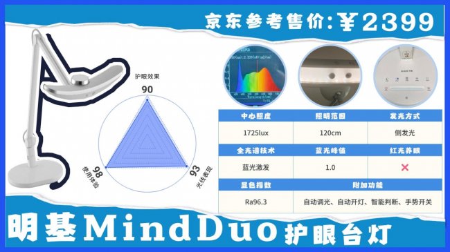 明基MindDuo的核心优势体现在智能化体验上。实测中它的入座感应和环境光自适应调光响应灵敏,能根据周围亮度自动调节输出,减少手动操作的麻烦。同时外观采用双翼弧形灯头设计,灯臂多角度可调,灵活性不错。在光线上它是34.5cm大光源面配合侧发光技术,实现1725lux的中心照度,可覆盖120cm桌面,日常使用亮度充足。不过从实测数据来看,它采用传统蓝光激发技术,蓝光峰值1.0,眩光控制属于中等水平。整体更适合看重智能功能和品牌设计、对护眼要求相对适中的家庭。