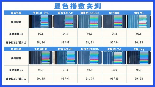 第二梯队集中在Ra96到97之间,包括松下致准、柏曼M1、飞利浦轩坦、欧普元悦2S和好视力TG035。但这里面有些款Ra看着不低,R9或R12却明显偏低:好视力TG035Ra97.9、R9达98,但R12仅75,蓝色还原弱;飞利浦轩坦同样R12只有75。柏曼M1、松下致准和欧普元悦2S则比较均衡,R9和R12都在90以上。