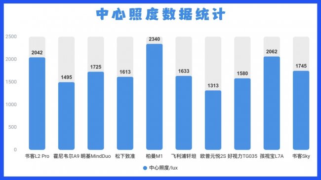 从中心照度来看,所有10款台灯都远超国AA级标准(≥500lux),亮度储备都很充足,满足日常读写完全没问题。但仔细看数据,不同款型之间的差距还是挺明显的。