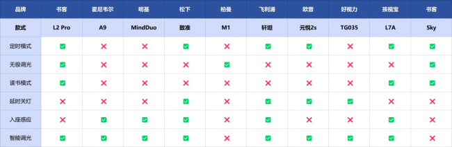 霍尼韦尔A9和明基MindDuo更侧重智能化体验。两款都配备了入座感应和智能调光,明基还支持手势操作,体验很科技感。松下致准和孩视宝L7A配置均衡,该有的功能基本都覆盖。柏曼M1、飞利浦轩坦、好视力TG035和欧普元悦2S功能配置相对简洁,没有太多花哨功能但基础体验扎实。