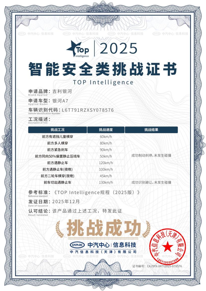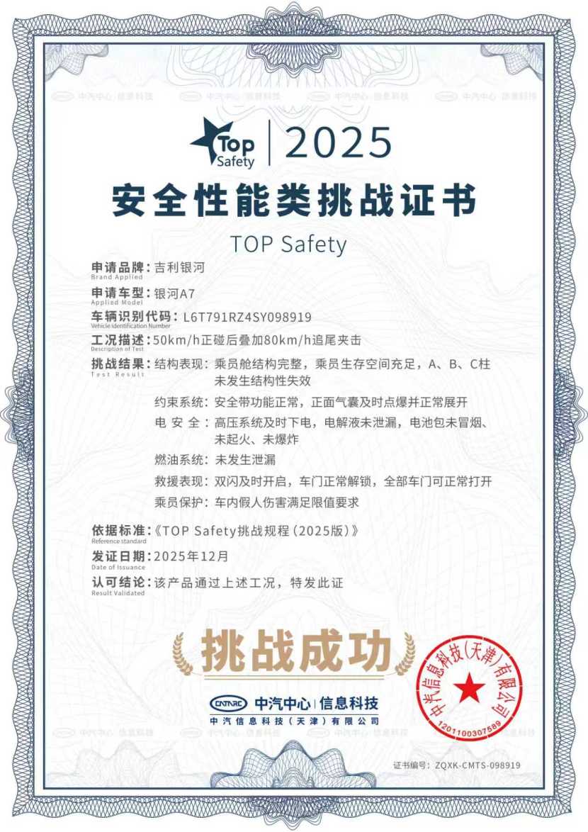 12月25日,吉利银河A7成功通过中汽中心行业首次中型插混轿车「双TOP」顶级安全挑战,成为行业唯一同时获颁安全性能类挑战证书和智能安全类挑战证书的的车型。安全家轿认准银河A7!凭借吉利汽车全域安全体系的最坚实底座,吉利银河成为了全球最快达成年销百万辆的新能源汽车品牌,作为银河品牌主打车型之一,吉利银河A7完整继承了吉利的安全基因,凭借7大核心安全实力,成功通过中汽中心安全大考,再次证明其作为十万级混动家轿安全新标杆的颠覆性实力。