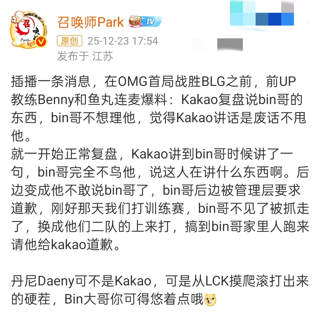 前职业教练曝光Bin黑历史与此同时,前UP战队教练突然正面开撕Bin一事,同样引发了不小的争议!事情是这样的,前UP战队教练在最近直播的时候爆料,前BLG教练Kakao和Bin曾爆发过“宫斗”,两人关系一度十分紧张,起因是在一次复盘的过程中,Kakao公开指出了Bin存在的问题,结果Bin却对此感到不以为然,甚至公开表示Kakao所说的都是废话!Kakao从此便不再敢批评Bin了。