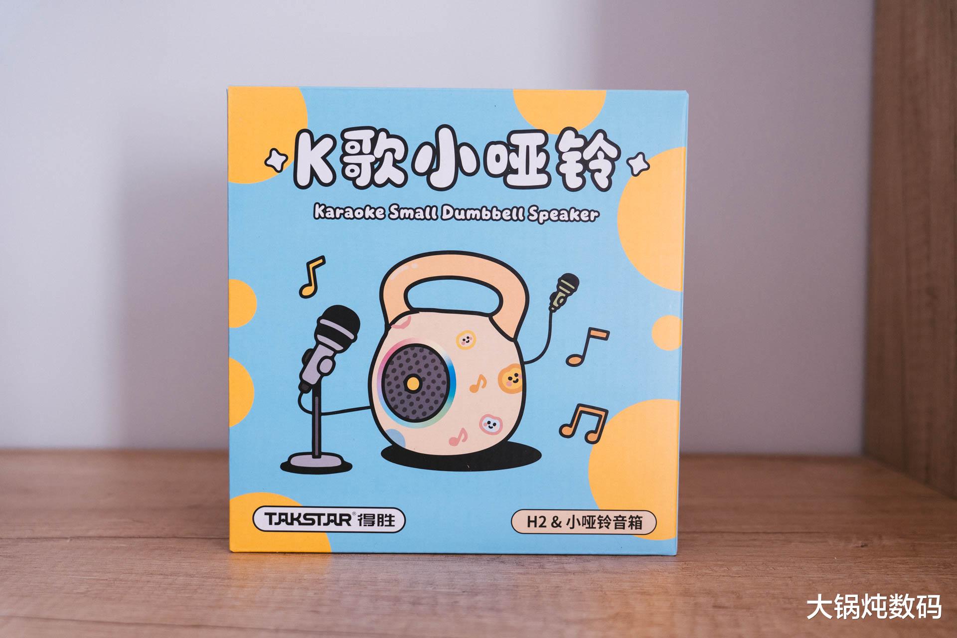 得胜H2 K歌小哑铃的包装非常卡通,一个小哑铃在唱歌,内部包含了一个音箱和两个麦克风,一套装备可以满足双人同唱的娱乐需求。
