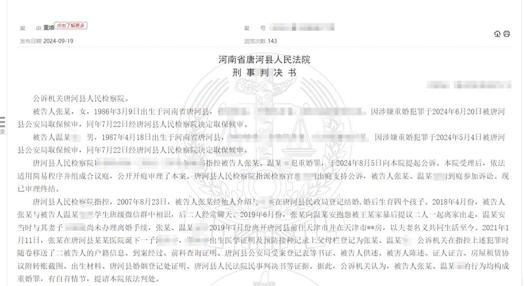 “私奔”之前,张、温二人都没有离婚。张女士与丈夫育有4个孩子,温先生与妻子育有2个孩子。近日,该案的一审刑事判决书公开,二人均因犯重婚罪获刑。