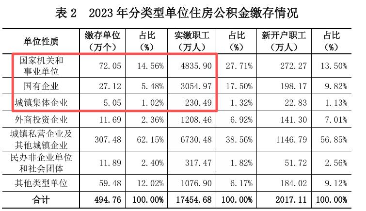 缴存层面:扩大覆盖范围,让更多人受益从缴存方面来看,公积金只能算“少数人”的福利。根据《全国住房公积金2023年年度报告》披露,全国缴存公积金的职工有1.75亿人,其中机关事业单位实缴职工4836万、国有企业实缴职工3055万、城镇集体企业职工实缴230.5万。换言之,体制内职工的公积金缴存人数超过8100万,占了全部缴存职工的近一半。