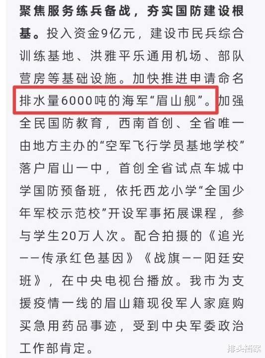 据四川省眉山市退役军人事务局官方账号证实,该市正在加快申请命名排水量6000吨的海军“眉山舰”。我们知道,在目前各型号处于建造状态下的国产舰艇中,以城市之名来命名的军舰基本都是驱逐舰和护卫舰这样的主战类舰艇。而6000吨级的排水量明显比054A型和054B型护卫舰大得多,但又小于055型万吨大驱,基本仅有052D系列“中华神盾”驱逐舰与之相符。