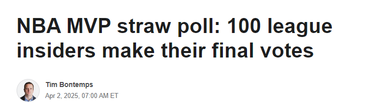 ESPN表示,如果他们最后一轮的模拟投票结果准确无误(注:ESPN过去5个赛季的最后一轮模拟投票结果都和实际结果相符),亚历山大将赢得他职业生涯的第一个MVP奖项。