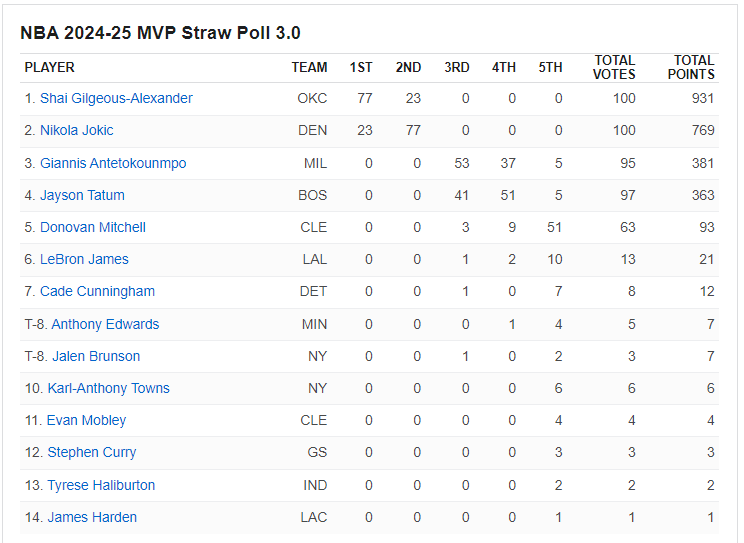 第三次的MVP模拟投票,一共有14位球员得到票数,具体的投票得分和排名如下——