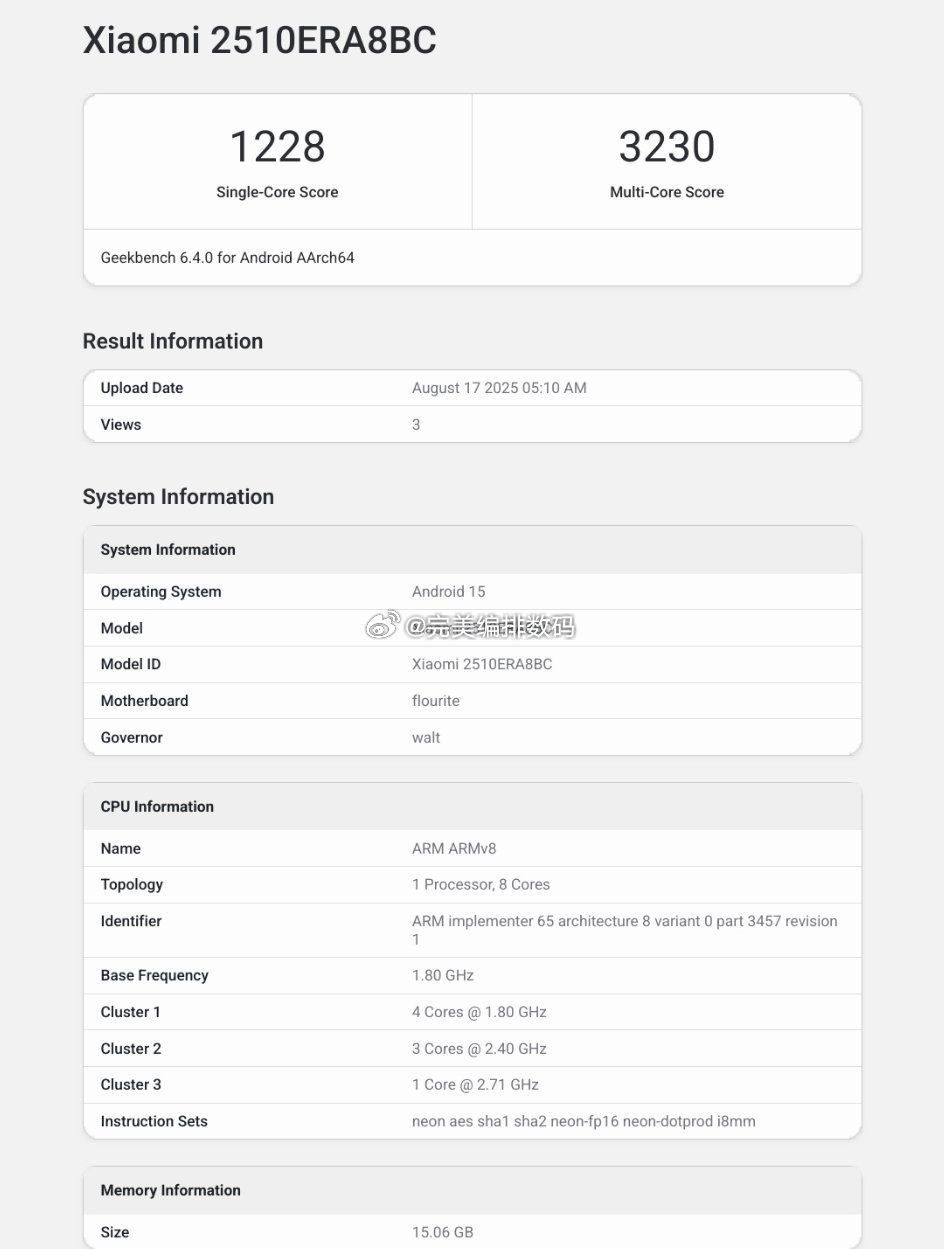近日,Geekbench出现型号2510ERA8BC的小米新机,博主确认是REDMI Note15 Pro+,其单核1228、多核3230的成绩被指向骁龙7s Gen4。
