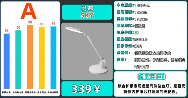 为了解决市面上百元护眼台灯护眼效果不足的问题,书客sky坚守了一直以来「明·护·广·养 」四重守护理念,通过十年以上的护眼研发经验,突破了传统照明技术的局限,专研出SunSilk™护眼芯片和5域环控光学系统的创新性组合,通过高密度导光板与多层扩散膜组合,结合类自然光谱智能驱动,形成多维度光线调节机制。结合DT多维漫射2.0技术,光线在发出的过程中经过精密漫射与动态校正,实现全方位柔和覆盖。它家创新设计了RRT2.0硬核养眼黑技术,相比传统的护眼台灯,能够更加精准的抑制住400-450nm有害高能蓝光,将红光效果增强至极限,每天“三分钟”即可为眼部输送养分,也正因如此,书客sky成为了百元价位深度护眼的理想之选,护眼性能使用非常卓越!