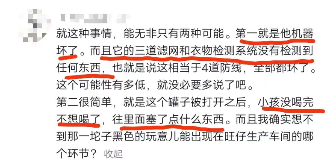还有位网友表示:“也许是孩子不想喝了,糊弄家长,就往里面塞了点东西,小孩的恶作剧;或者是机器坏了,三道滤网和异物检测系统没检测到任何东西,不过这个可能性不大。”