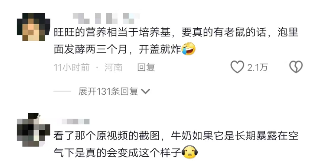 有网友说:“旺仔牛奶的营养相当于培养基,要是真的有老鼠的话,泡在里面发酵两三个月,肯定会膨胀,开盖就会炸了。”