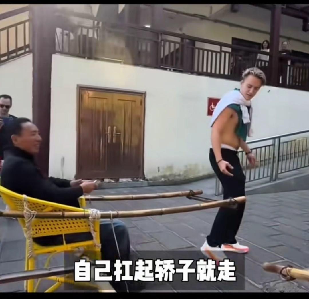 结果几名老外小伙直接脱了上衣,将师傅直接按到了轿子上面,师傅本来还有些纳闷,不料两名小伙迅速将他抬了起来,又给钱,又抬轿子的,可把师傅乐坏了,平时都是自己抬客人,没想自己有生之年还能被洋人给抬了!